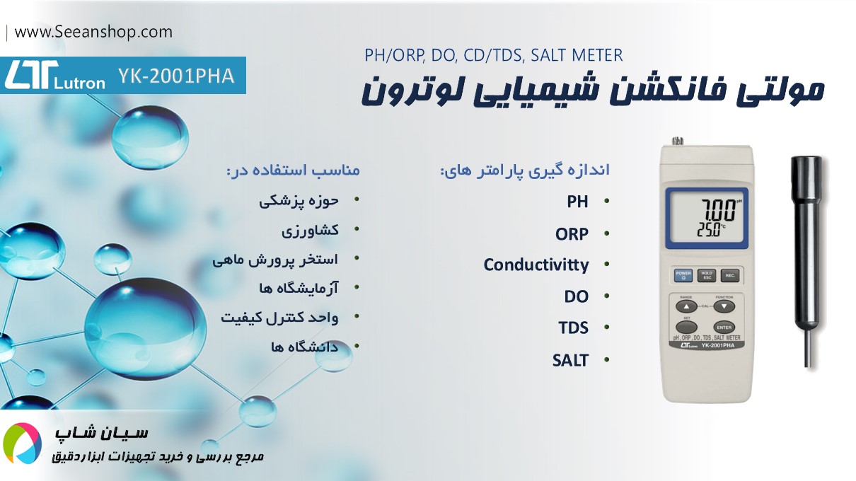 پی اچ متر مولتی پارامتر لوترون LUTRON YK-2001PHA از تجهیزات اندازه گیری چندکاره که شاخص های Conductivity, TDS, Salt را با پراب حرفه ای اندازه گیری می کند و مجهز به ریزپردازنده ای است که دقت حداکثر را تضمین می کند همچنین با اضافه کردن پروب های اختیاری کاربر می تواند پارامتر های PH, ORP, Do را اندازه گیری کند.