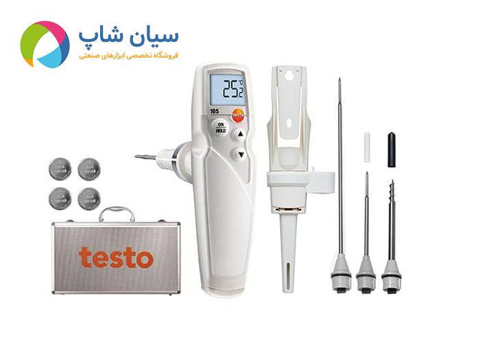 دماسنج تماسی میله ای غذا مدل testo 105 یکی از حرفه ای ترین تجهیزات تولید شده تحت برند تستو آلمان است که برای اندازه گیری دما در مواد غذایی طراحی شده است. کیت کامل این دستگاه شامل سه عدد پراب برای انجام اندازه گیری های مختلف بر اساس سطح و حالت ماده است پراب اولیه این دستگاه که به نام پراب استاندارد( Standard measuring tip ) شناخته می شود جهت اندازه گیری مواد نیمه جامد و مایع (غیر یخ زده) مانند گوشت غیر یخ زده یا گرم لبنیات مانند پنیر و کره و انواع ژله ها و... استفاده می شود. پراب فرآورده یخ زده (Frozen Goods) برای اندازه گیری دمای فرآورده های یخ زده حتی نفوذ به عمق این مواد مناسب است و پراب اندازه گیری دما طولانی مدت قابل نصب بر روی تستو 105 برای اندازه گیری های طولانی مدت در مایعات استفاده می شود.