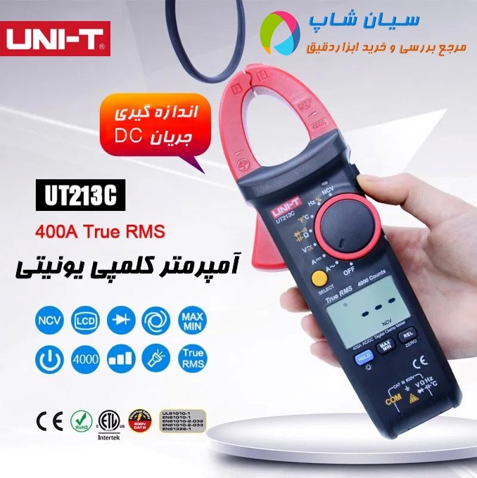 کلمپ مولتی متر دیجیتالی با دقت TRUE RMS یونیتی مدل UNI-T UT-213C با کیفیت مناسب و قیمت ارزان قادر به اندازه گیری شدت آمپر تا 400 آمپر AC با دقت +/- (2.0%+3) و اندازه گیری ولتاژ تا 600 ولت AC /DC با دقت اندازه گیری ولتاژ از +/- (0.8%+5) و اندازه گیری مقاومت تا 40 مگا اهم با دقت +/- (1%+2) و اندازه گیری فرکانس از 10هرتز تا 1 مگا هرتز ، ظرفیت خازن از 50 نانو فاراد تا 40 میلی فاراد می باشد.