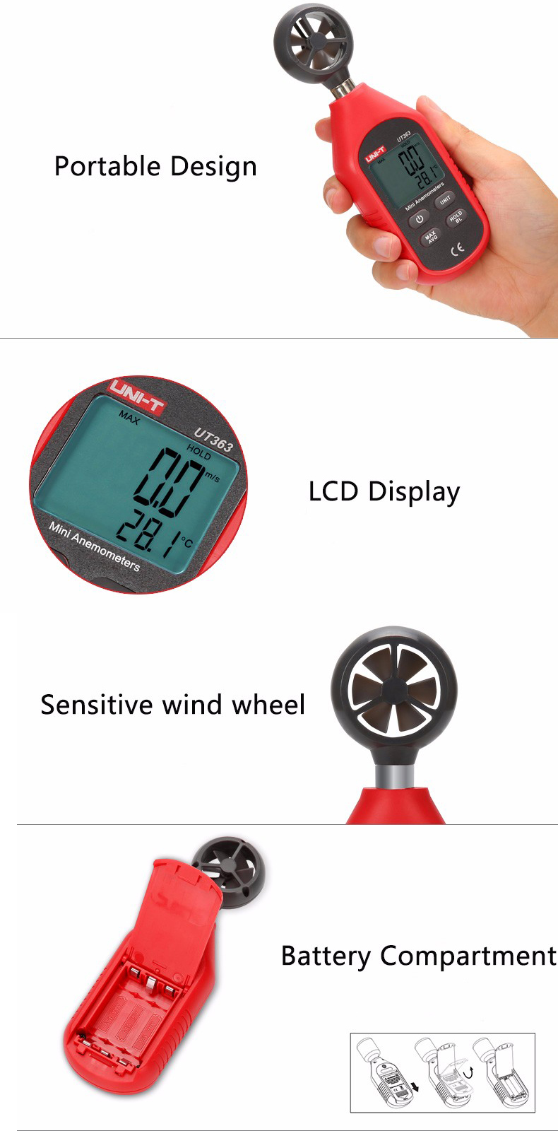 بادسنج دیجیتال یونیتی مدل UNI-T UT363 به آخرین تکنولوژی های سنجش مغناطیسی مجهز است . دستگاهی سبک با وزن 118 گرم، کارایی و کیفیت ساخت بالایی دارد که برای تستر باد و دما از آن استفاده می شود . دقت اندازه گیری سرعت باد از صفر تا 30 متر بر ثانیه و دما 10- تا 50+ درجه و دارای قابلیت اتوپاور 5 دقیقه و میتواند داده ها را به طور مستقیم روی صفحه LCD نمایش دهد، همچنین دارای دیتا هولد و حالت خاموش شدن خودکار نیز می باشد.