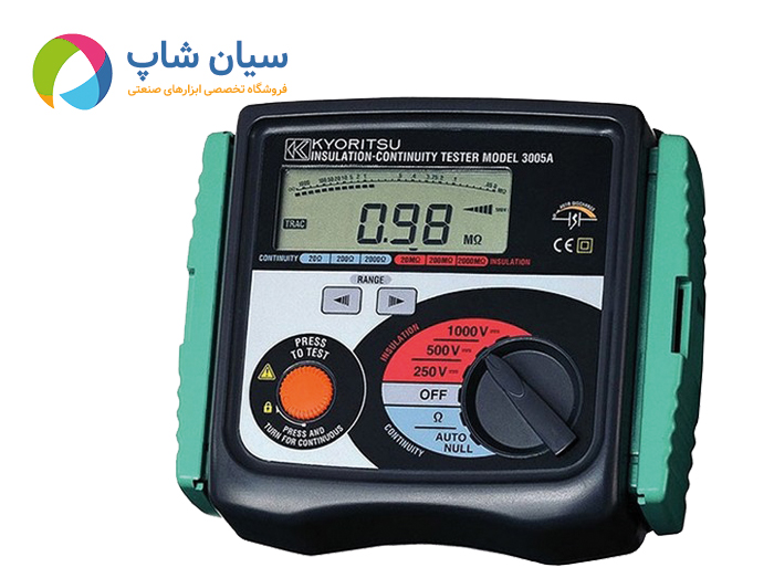 تستر مقاومت عایق KYORITSU 3005A محصول برند معتبر کیوریتسو ژاپن که دارای تست ولتاژ از 250تا 1000ولت میباشد و نیز دارای Bargraph برای نشان دادن مقاومت عایق میباشد.