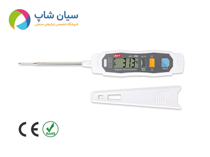 دماسنج میله ای دیجیتال یونیتی UNI-T A61 از سری دماسنج های پرتابل برند یونیتی با پراب استیل ضد زنگ FDA، پوسته محافظ و درجه حفاظتی IP65 از مقاومت بسیار بالایی برخوردار است.