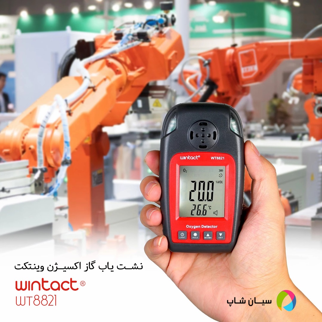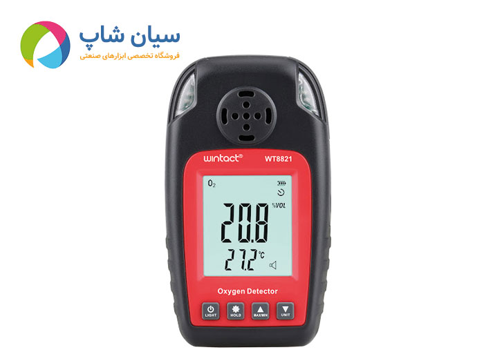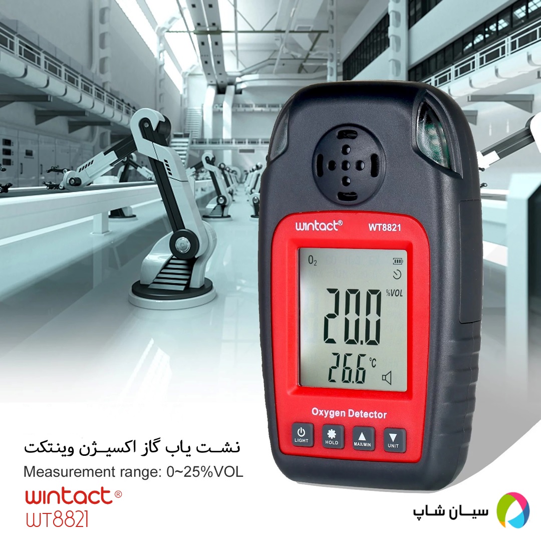 دستگاه سنجش گاز، دتکتور گاز اکسیژن وینتکت Wintact WT8821 به منظور شناسایی تجمع گاز اکسیژن طراحی شده است. سنسور تعبیه شده در این گازسنج از کیفیت و دقت بالایی برخوردار است که سنجش های دقیق و مطمئن را امکان پذیر می کند.