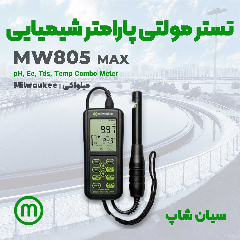 دستگاه پی اچ و انداکتیویتی متر Milwaukee MW805 MAX آمریکا به کاربر امکان می دهد با استفاده از یک متر و پروب یکپارچه مقادیر pH، رسانایی و میزان مواد جامد محلول (TDS) را به راحتی و با دقت آزمایش کنند.