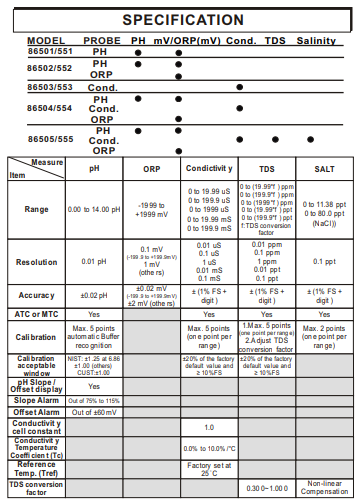 مشخصات فنی مولتی متر رومیزی پرینتر دارPH/EC/TDS/salt/MV/TEMP مدل AZ-86555: