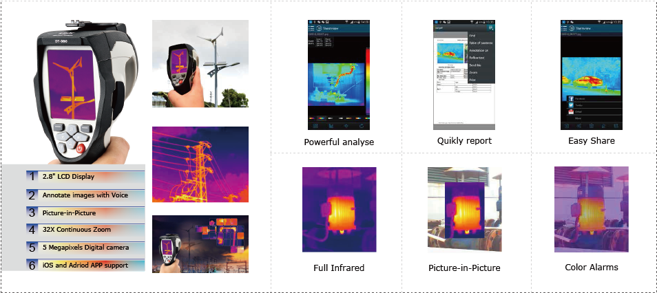 DT-980 (80x80), DT-982 (160x120) Thermal Imagers are designed to make your work easier, more productive and effective. 160 × 120 resolution at 50 Hz for real-time capture, temperature range from -20°C to 350°C (-4°F to 662°F), 32X continuous zoom, picture-in-picture, voice comment recording and text annotation on images. Hot/Cold spot marker automatically finds the hottest and coldest spots. It includes memory card, Lithium polymer battery & power supply, and USB cable. Wi-Fi connectivity allows the Infrared Thermal Camera to send images and data to mobile devices.